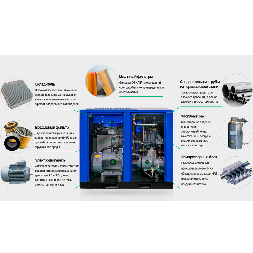 Компрессор изготовлен с использованием передового винтового блока по немецким технологиям и профильного дизайна SAP. Он включает адаптированные компоненты от известных брендов, таких как электроника Schneider и сенсор давления Danfoss, что гарантирует его надежность и долгосрочную бесперебойную эксплуатацию. Высококачественная гибкая муфта обеспечивает низкое энергопотребление, а интеллектуальный многоязычный LCD контроллер делает использование устройства комфортным и безопасным.